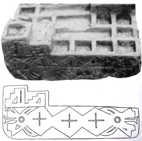 Figure G — A yupana from the Pashash site, Recuay culture (540 AD), found during the summer of 1971. (Smith, Jr., J. Recuay gaming boards: a preliminary study. Revista Indiana, 4; 1977, p.27)