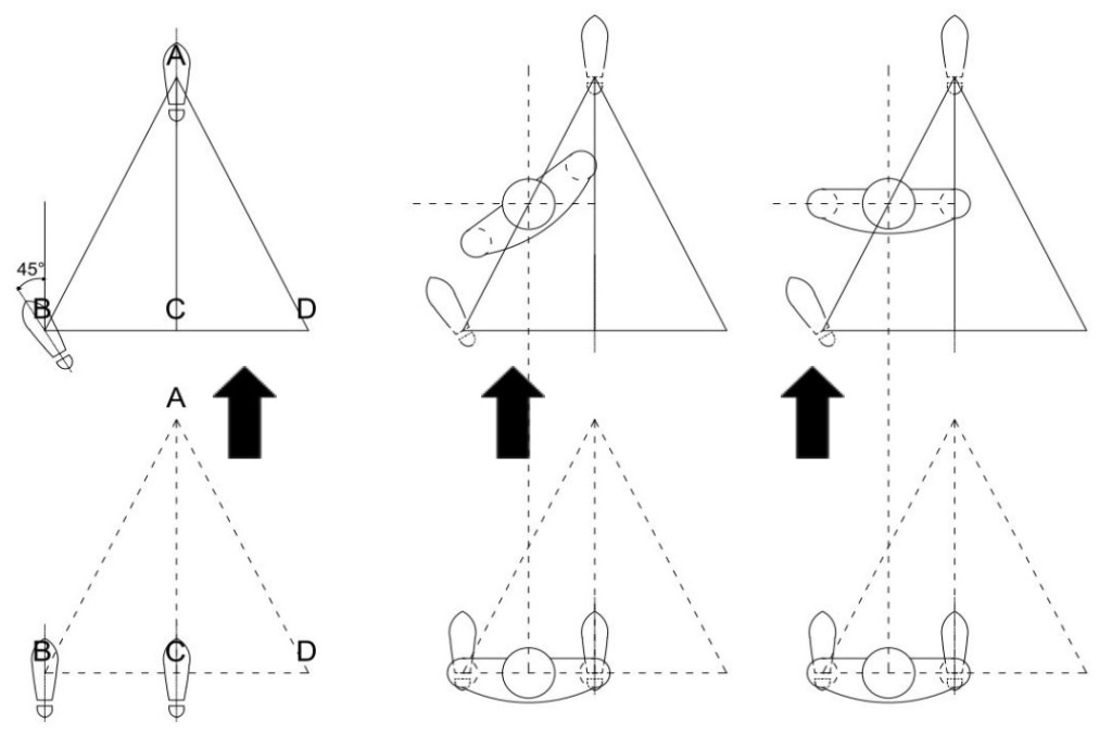 En la postura de combate que se describió anteriormente y sus dos opciones (cadera frontal o levemente lateralizada a 45 grados), la línea de fuerza máxima ocurre siempre hacia donde apunta el pie delantero de la postura (línea AC). En las variantes lo que sucede, es que la resistencia que se puede realizar desde la línea de máxima fuerza o resistencia hacia cada lado varía diferente según la opción. En la opción cadera lateralizada, a partir de los 45 grados hacia el lado opuesto de la postura (si es postura derecha con pie izquierdo adelante, el lado opuesto es a la izquierda de la línea central), si bien es estable no podemos seguir haciendo resistencia por que nos obliga a soltar la espada de una de las manos, por ende hay 45 grados antes de completar los 90 en los que la postura es estable pero no podemos realizar resistencia a ningún impacto o ejercer eficazmente alguna técnica, la única forma es rotar la cintura hasta frontalizar el torso, pasando a la otra opción. Ambas opciones presentan su línea de resistencia nula a 45 grados de la línea de fuerza máxima hacia el lado de la postura (si estoy en postura derecha de pie izquierdo adelante, el lado de mi postura es a la derecha). Esto se puede observar porque en numerosos estilos de combate se busca atacar a 45 grados; es porque al tener posturas similares sus líneas de fuerzas son prácticamente idénticas. A modo de ejemplo y justificación, si estuviéramos parados como en la primera imagen con los pies en BC o en B y D, esa postura tiene su línea de fuerza en BD o BC y su línea de fuerza nula a 90 grados (paralela a AC), el margen de inestabilidad es muy grande, la postura de combate propuesta (pies en AB o AD) se caracteriza por reducir al máximo la zona de inestabilidad a disposición de un oponente que inicia el combate frente a nosotros.