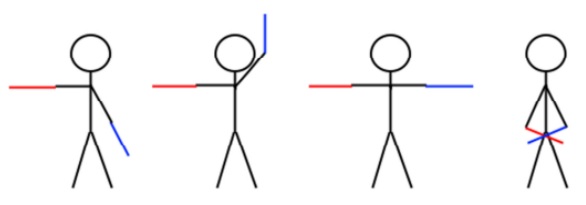 -Bandera alzada horizontalmente y la otra bandera apuntando al suelo: golpe directo del esgrimista con el color de la bandera alzada.