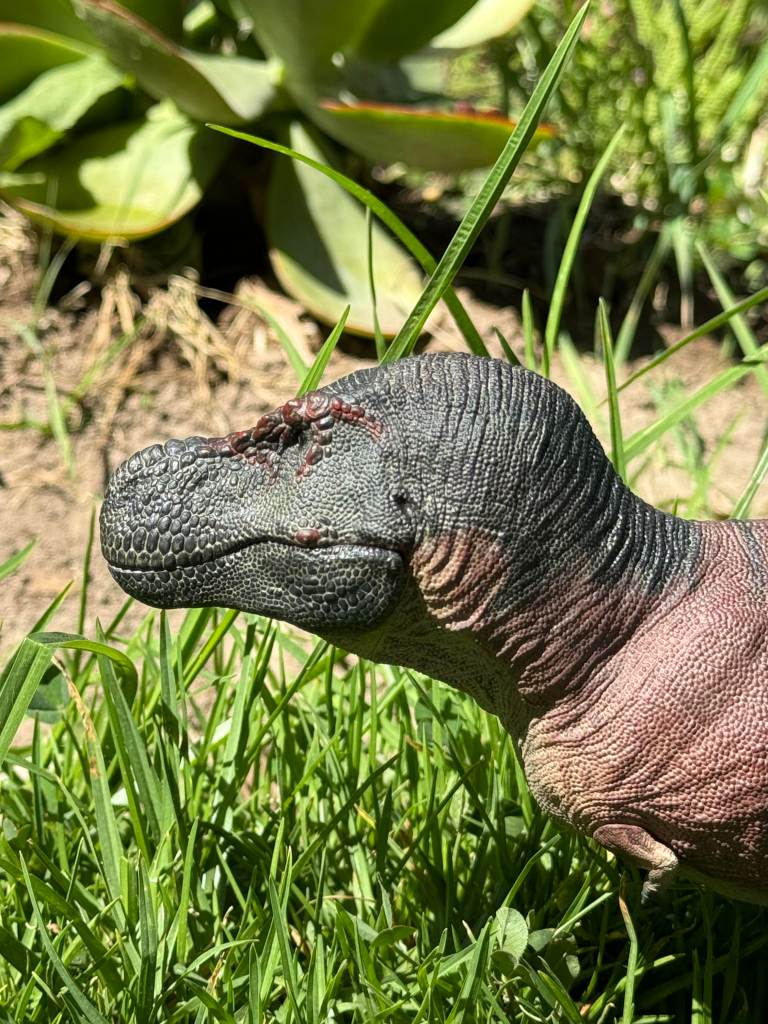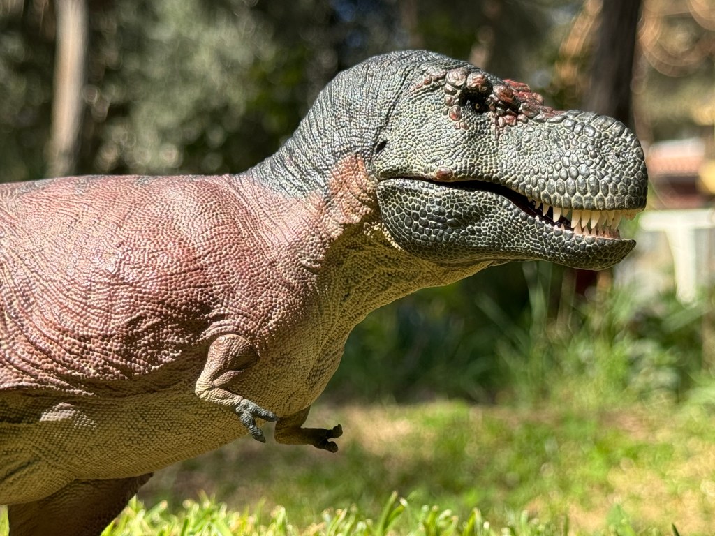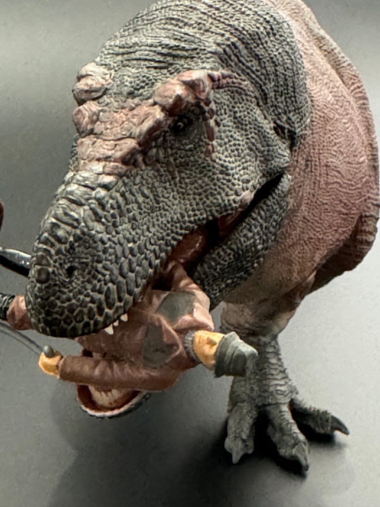 Sin embargo, lo que llama más la atención es la presencia de labios en su boca. En un artículo publicado en 2016 (6) se postuló la idea de que los terópodos como el Tyrannosaurus rex poseían labios, ello debido a la presencia de esmalte en sus colmillos, el cual requiere mantenerse hidratado para prevenir su desgaste. Hasta entonces se creía que los terópodos tenían los dientes expuestos de manera similar a los cocodrilos; sin embargo, estos son reptiles acuáticos, por lo que sus colmillos se mantienen constantemente hidratados. Y es precisamente este rasgo el que presenta Kiss; de ahí el nombre (vale recalcar que los nombres de algunas figuras de REBOR hacen alusión a bandas y artistas de rock, heavy metal y rap). Desafortunadamente, la mandíbula de Kiss no cierra del todo bien, y hay que presionarla fuertemente por algunos segundos en la parte posterior (justo en la base de la mandíbula) para que se mantenga cerrada. Por otra parte, los colmillos que REBOR les proporciona a sus figuras son de una belleza impresionante, con un brillo húmedo casi natural que imita bastante bien el esmalte de una criatura viva, por lo que sería una pena no exponer esas puntiagudas perlas.