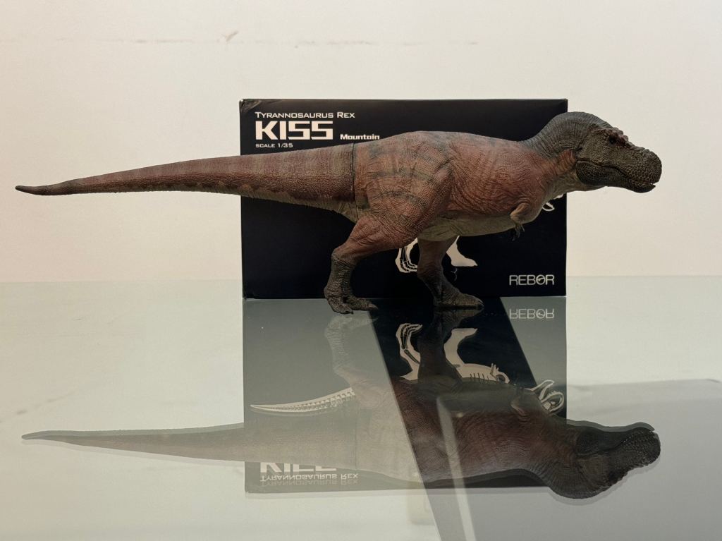 “Kiss”, el Tyrannosaurus rex de REBOR es una interpretación muy interesante de este dinosaurio; el esculpido fue muy bien trabajado, y las escamas no son uniformes, sino que presentan variaciones en su tamaño en distintas partes del cuerpo. Muchos coleccionistas quedaron impresionados con la gran precisión científica de este modelo, pues REBOR suele darse bastante licencia artística con sus figuras. Posee esas irises doradas y globos oculares negros tan característicos de REBOR, así como una coloración bellísima oscilante entre el negro y un opaco carmesí alrededor del cuerpo. Tiene las patas oscuras, como es natural en las aves terrestres, y algunas partes de su cuerpo parecen estar cubiertas de una fina capa de polvo. Es una figura de gran tamaño para una escala 1:35 (más bien de escala 1:32), bastante pesada, con mandíbula y brazos articulados, y una cola que viene separada del cuerpo para no hacer muy grande la caja. La desventaja de ello es que la coloración de la cola es distinta a la del resto del cuerpo, aunque no es muy notorio, y se puede apreciar la línea divisoria entre la cola y el cuerpo. Por otra parte, es una cola hecha de un plástico más blando que, al ser móvil, nos ofrece una mayor variedad de poses.