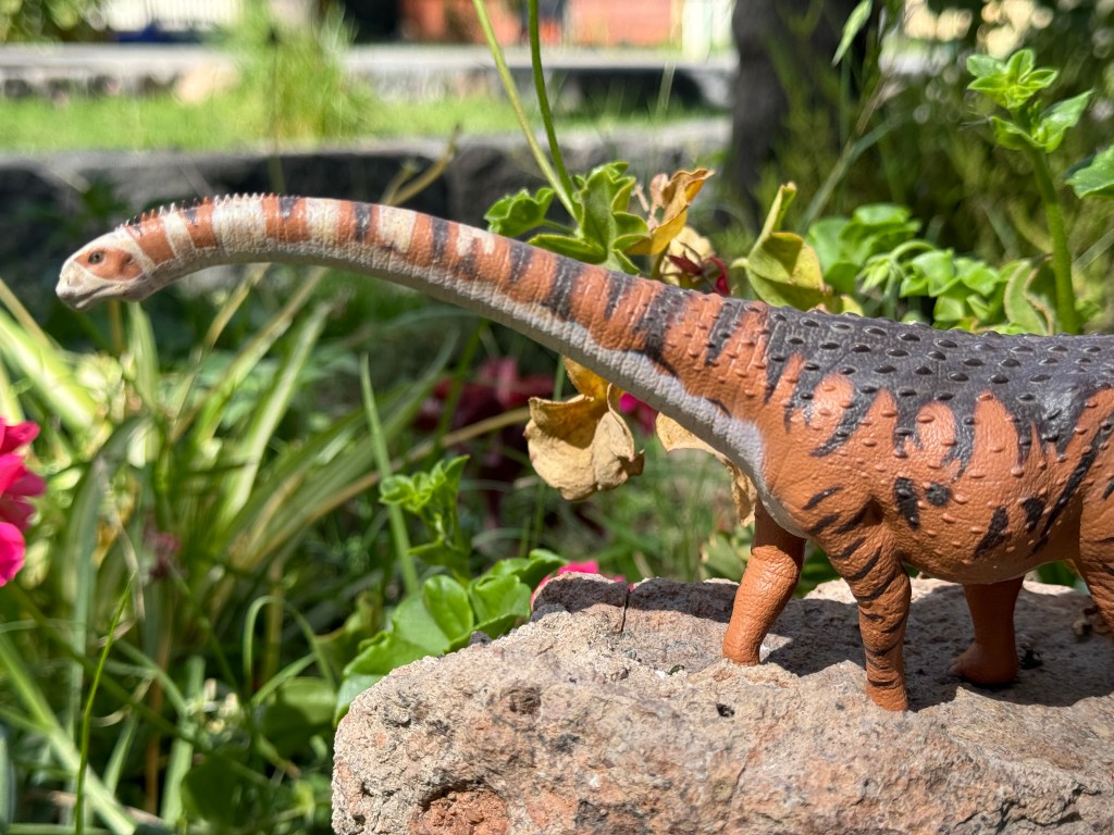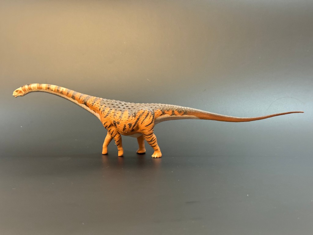 Su espalda está recubierta por un gran número de osteodermos, y tiene el vientre hinchado, algo bastante acertado ya que el vientre de muchos herbívoros de gran tamaño tiende a hincharse a causa del proceso de fermentación y digestión de sus estómagos. Los ojos han sido pintados con gran realismo, y están entre mis favoritos de entre las figuras de Safari Ltd, pues poseen una tonalidad y brillo bastantes naturales. Otro punto a favor de la precisión científica de la figura es que carece de la garra alargada del pulgar que exhiben varios titanosaurios en sus patas delanteras, un detalle muy acertado.