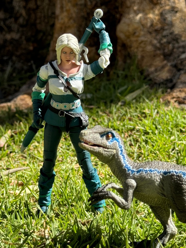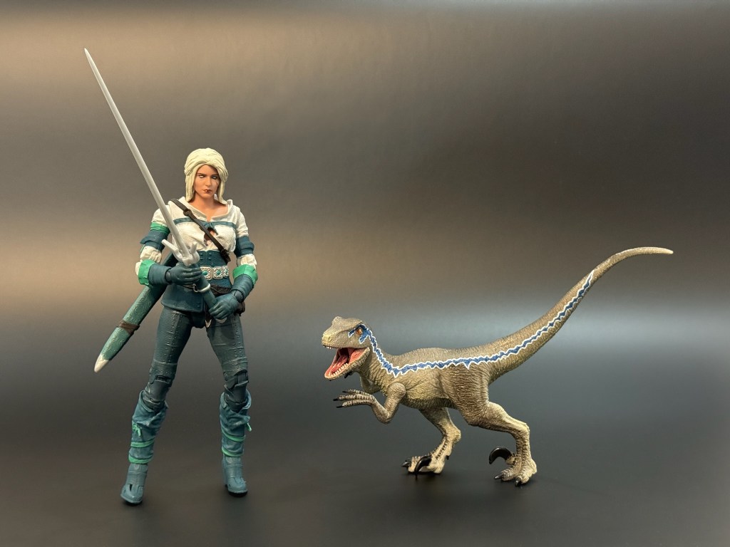 Comparación entre un humano (Ciri Elder Blood de The Witcher y McFarlane Toys) y Velociraptor TNG. Escala 1:10