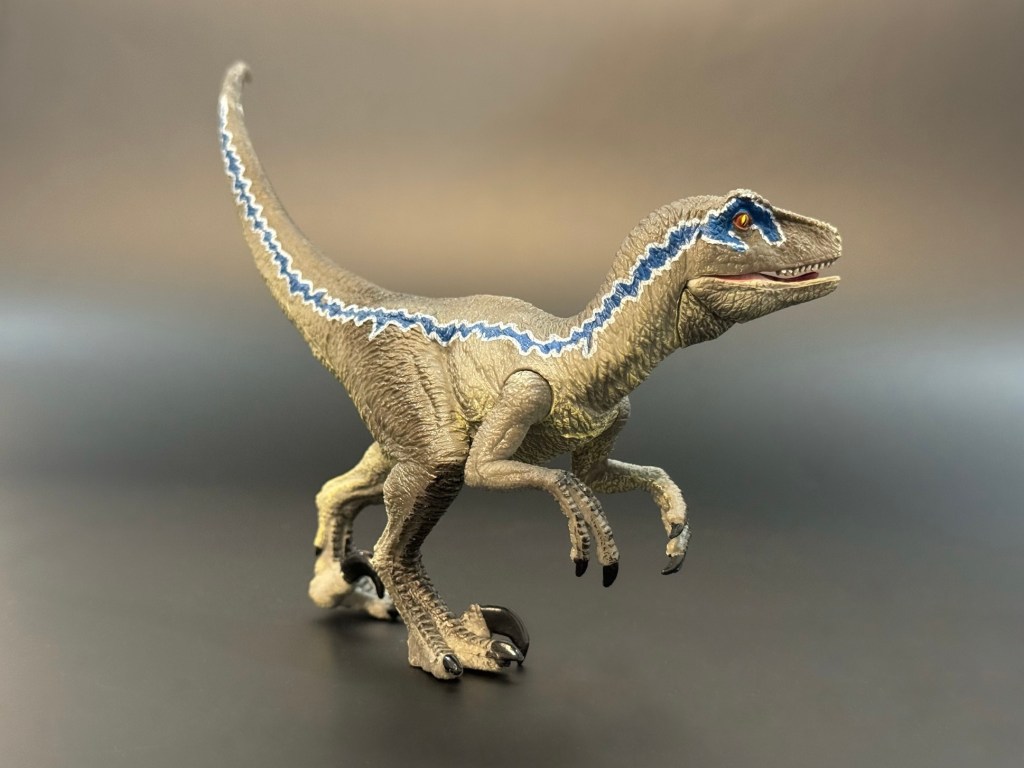 Esta figura de TNG está basada en el Velociraptor de Jurassic Park, por lo que carece de plumas. Velociraptor mongoliensis tenía una longitud de entre 1.5 a 2.07 metros y aproximadamente 0.5 metros de alto a la altura de la cadera (1), pero los de Jurassic Park tienen una longitud de 2.7 metros y 1.8 metros de alto. Por supuesto, para cuando la novela fue publicada no se tenía mucha información sobre este dinosaurio, y según relata su autor, Michael Crichton, el Velociraptor en su novela estaba inspirado en el libro “Predatory Dinosaurs of the World: A Complete Illustrated Guide” de Gregory S. Paul. Este libro fue publicado en 1988, y mencionaba que Deinonychus antirrhopus, un dinosaurio celurosauriano dromeosáurido de mayor tamaño que Velociraptor mongoliensis podría ser incluido dentro del género Velociraptor en el futuro, algo que como sabemos no llegó a suceder debido a que ambas especies presentan suficientes diferencias como para pertenecer al mismo género. En cualquier caso, es a causa de este libro que el autor de Jurassic Park optó que su Velociraptor tuviera dimensiones más próximas a Deinonychus antirrhopus que a Velociraptor mongoliensis (2).