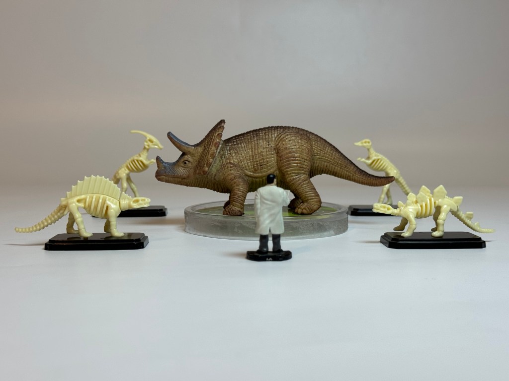Triceratops fue un género de dinosaurio ceratópsido que vivió durante el Cretácico Tardío en lo que hoy es el oeste de Norteamérica. Podía alcanzar los nueve metros de largo y pesar hasta 10 toneladas (37), lo que lo hace uno de los ceratópsidos de mayor tamaño descubiertos, compitiendo por el título únicamente con su contemporáneo Torosaurus. También compartió su hábitat con Tyrannosaurus rex, el cual es representado como su máximo antagonista en la cultura popular. Triceratops significa “rostro con tres cuernos”; con un cuerno por encima de cada ojo y uno más sobre las fosas nasales, es uno de los dinosaurios más icónicos de todos los tiempos.