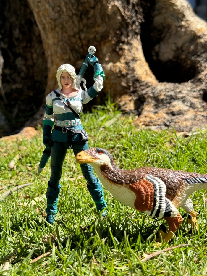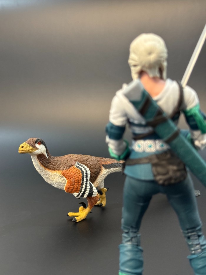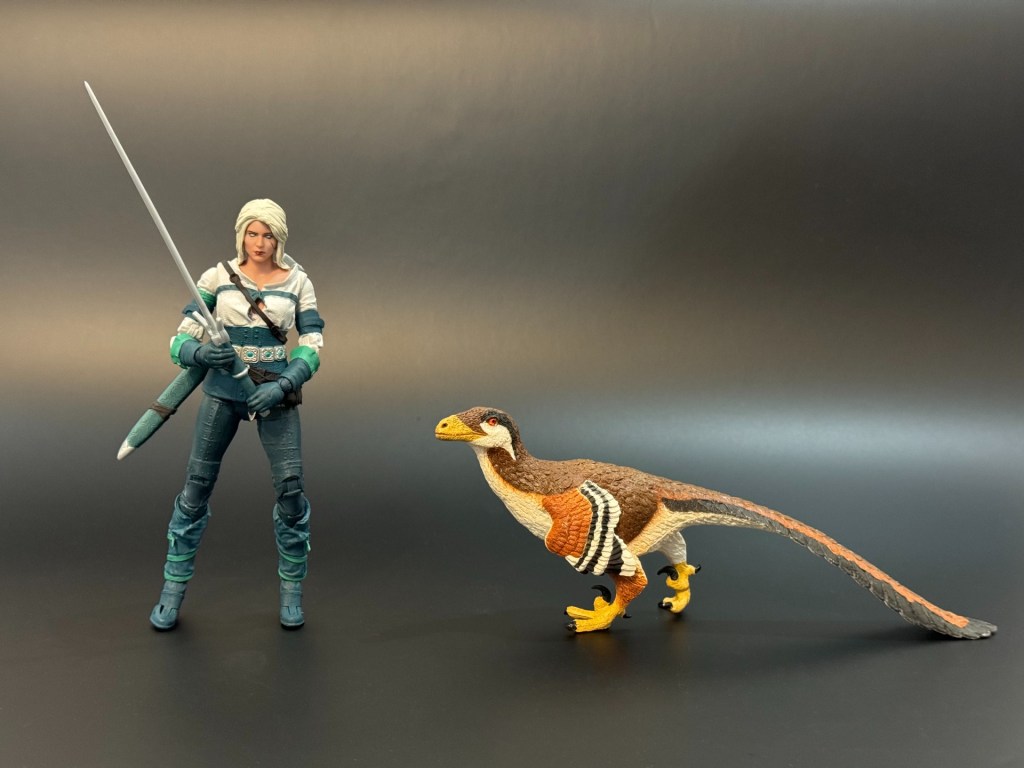 Comparación entre Deinonychus antirrhopus (subadulto) y un ser humano (Ciri Elder Blood /The Witcher – McFarlane Toys).